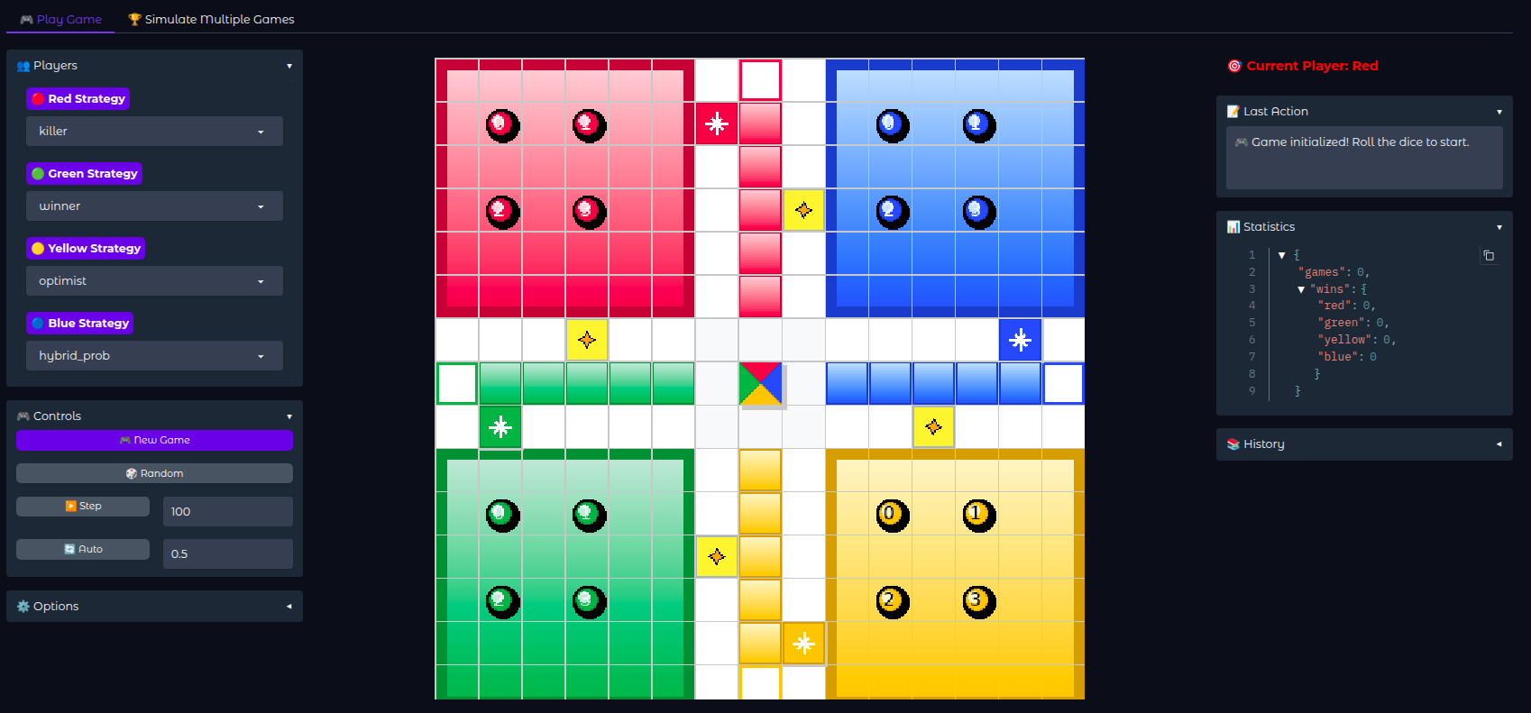 A comprehensive Python Ludo game engine with advanced AI strategies and Gymnasium-compatible RL environment for self-play training and strategy research.